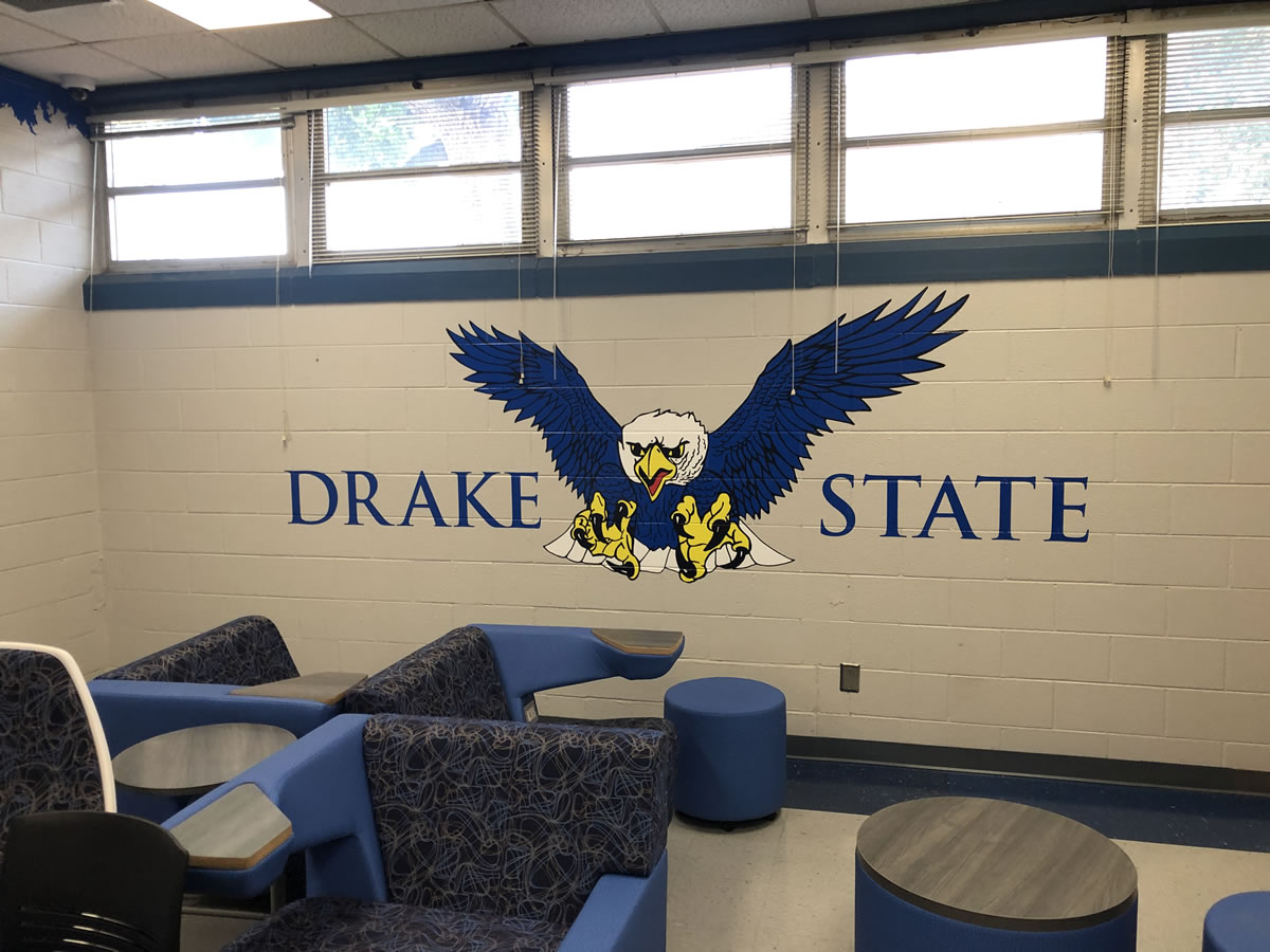 Trav-Ad Signs was awarded, and recently helped Snead State Community College with all re-branding signage, including all room and wayfinding signs; and with the vinyl graphic wall murals (shown below) on the walls in the main lobby of the new Aviation Building in Guntersville, which were previously blank. The entire project was completed in one week.